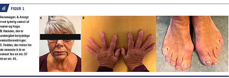Ved fornyet undersøgelse bemærkede man patientens store hænder, og hun kunne direkte adspurgt oplyse, at handskestørrelsen var øget fra 6,5 til 8,5, og at hun havde fået udvidet fingerringene. Hun fortalte, at håndfladerne føltes fugtige. Skostørrelsen var inden for ti år steget fra str. 37 til str. 41. Nattesved og snorken var også tilkommet. Den objektive undersøgelse afslørede karakteristisk akromegal fremtoning i form af kraftigt hageparti og næse samt store hænder og fødder (Figur 1). En objektiv ledundersøgelse viste osteoartrose. Biokemiske undersøgelser bekræftede mistanken om akromegali med forhøjet seruminsulinlignende vækstfaktor 1 på 139,5 nmol/l (referenceværdi: < 26,6 nmol/l). Der fandtes ikke tegn på hypofyseinsufficiens, da der var normalt prolaktinniveau, sufficient stigning i serumkortisolniveau efter synactentest, normale niveauer af trijodtyronin og thyroideastimulerende hormon samt normale postmenopausale gonadotropinniveauer. En efterfølgende MR-skanning viste et typisk makroadenom i hypofysen med en maksimal diameter på 18 mm. Udredning for artritissygdom viste normale forhold.