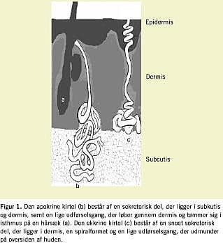 De apokrine kirtler er større end de ekkrine og måler 3-5 mm i diameter. De findes dybt i dermis eller i subcutis. De består af en snoet rørformet sekretorisk del, der via en udførselsgang tømmer sig i infundibulum af hårfolliklerne (Figur 1). De producerer en mere viskøs væske end de ekkrine, hvis kemiske sammensætning kun er delvist kendt [2]. Bakteriel nedbrydning af sekretet giver den karakteristiske svedlugt. De apokrine kirtler udvikles i puberteten, og apokrin sekretion kan ændres periodisk, for eksempel øges størrelsen og aktiviteten af epitelcellerne i kirtlerne præmenstruelt og aftager i løbet af menstruationen.