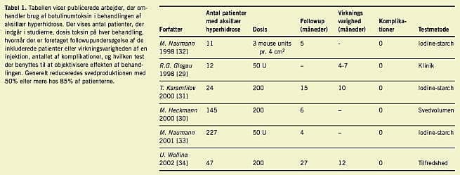 I de foreliggende studier [29-34] har man fundet, at injektion af botulinumtoksin effektivt nedsætter svedproduktionen ved aksillær hyperhidrose med mere end 50% hos 70-90% af de behandlede patienter (Tabel 1 ). Der rapporteres om en virkningsvarighed på mellem otte måneder og 12 måneder hos 70-80% af de behandlede patienter [2-5, 29-34] og ingen bivirkninger. Det største problem for patienterne er ubehaget ved injektionerne, da behandlingen må gentages, når virkningen aftager. Det vides endnu ikke, om effekten af botulinumtoksinet er uændret, eller hvilke bivirkninger der optræder ved gentagne injektioner over en periode på flere år.