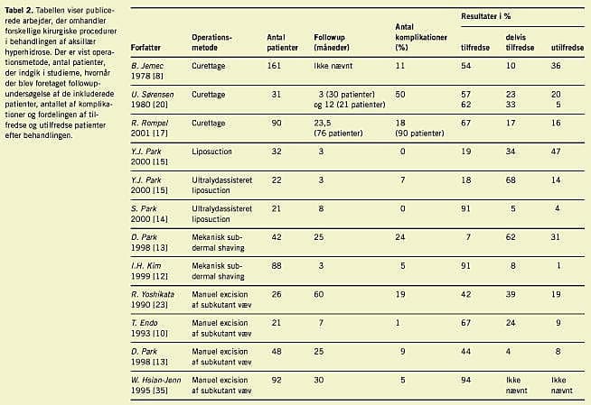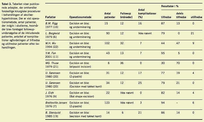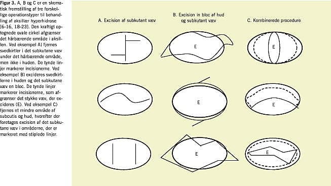 I litteraturen er der beskrevet tre operationstyper til excision af aksillært væv (Figur 3 ): subdermal excision af subcutis, excision af hud og subcutis en bloc og en kombination, hvor man exciderer hud og subcutis en bloc i et mindre område og herefter supplerer med subdermal excision i resten af aksillen. En oversigt over litteraturen inklusive komplikationsfrekvenser findes i Tabel 2 og Tabel 3 .