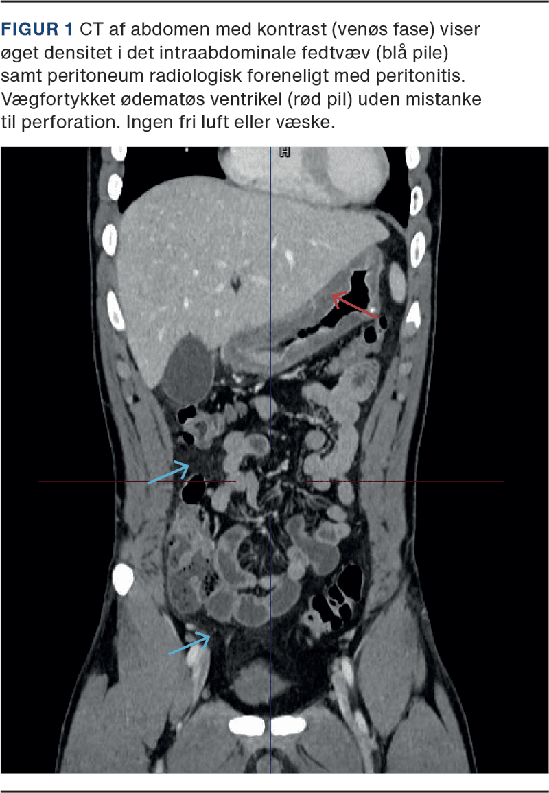 På baggrund af uafklaret akut abdomen med peritonealia blev akut højrisiko abdominalkirurgi (AHA)-forløb iværksat inkl. administration af piperacillin/tazobactam. CT af abdomen viste let fortykket ventrikelvæg og diffus peritonitis uden oplagt indgangsport (Figur 1).
