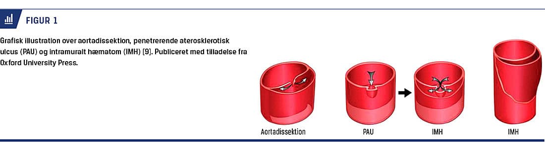Klassisk aortadissektion, som er den hyppigste undergruppe af akut aortasyndrom [9], sker ved en brist i aortas intima, hvorved karvæggens lag spaltes fra hinanden, og to lumina opstår. Dissektionen kan involvere afgangen af visceralarterierne, med risiko for iskæmi af de organer, der forsynes fra aorta (nyrer, tarm og ben) til følge. Desuden kan der opstå hjertetamponade og ruptur af aorta [9]. Intramuralt hæmatom opstår ved ruptur i vasa vasorum i media og kan betragtes som