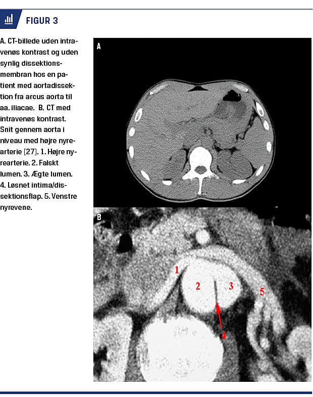 Udvikling af EKG-gated CT-angiografi skaber mulighed for endnu mere præcis diagnostik, da man med denne nye teknik kan fjerne pulsationsartefakter [2, 12]. I international litteratur anbefales herudover CT uden kontrast forud for en optimal kontrastundersøgelse for at kunne visualisere et evt. intramuralt hæmatom eller en forkalkning langs intima [10, 12] (Figur 3).
