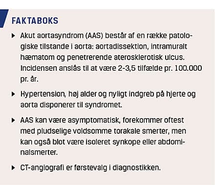Formålet med denne artikel er at øge opmærksomheden på forekomsten af akut aortasyndrom og den kliniske præsentation samt at understrege, hvor vigtig optimal billeddiagnostik er i diagnosticeringen.