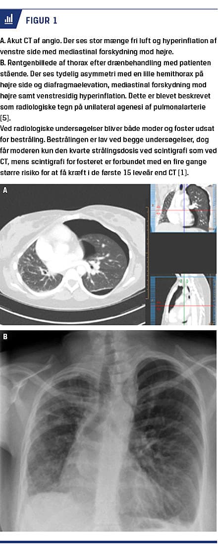 CT’en viste ingen tegn til lungeemboli, men overraskende manglende afgang af højre pulmonalarterie. Samtidige fund var hypoplastisk højre lunge og hyperplastisk venstre lunge, der strakte sig ind over midtlinjen. Forebyggende for recidiverende pneumothorax foretog man talkumpleurodese, og patienten fødte vaginalt og ukompliceret.