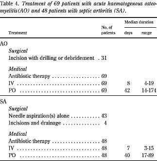 Summary Epidemiological, bacteriological, and long-term follow-up data of 69 children with acute haematogenous osteomyelitis and 48 children with septic arthritis. A 10-year review. Ugeskr Læger 2001; 163: 4177-81. Introduction: The proper treatment of patients with acute haematogenous osteomyelitis and acute suppurative arthritis is still controversial. Based on a previous study, a treatment regimen was recommended. We now report on the clinical, bacteriological, and radiological aspects of the diseases, with special attention to possible changes in the natural history of the diseases and the long-term prognosis. Material and methods: A total of 69 children with acute haematogenous osteomyelitis and 48 with septic arthritis admitted in the period 1977-1987 were entered in a retrospective review. Epidemiological and bacteriological data were analysed and compared to those of an earlier study (1965-1974), confined to the same geographical area. Long-term outcome was assessed by a questionnaire and clinical-radiographic follow-up. Results/conclusions: A significant increase in the admission rate for both disorders was seen. The long-term outcome was favourable, with major sequelae found in only three patients (3%) and minor sequelae in two patients (2%). The benign long-term outcome may well be related to quick admittance to hospitals and long-lasting, appropriate antibiotic treatment.