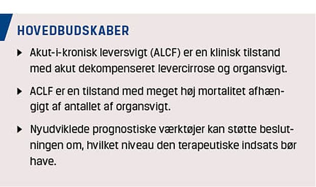 ACLF er en kritisk forværring ved dekompensation hos patienter med levercirrose og er kendetegnet ved progredierende organsvigt. Tilstanden har en meget høj mortalitet, selv hvis hurtig og intensiv behandling iværksættes. CLIF-C-ACLF-scoren giver overblik over prognosen og kan støtte beslutningen om initiering, fortsættelse eller afbrydelse af terapi.