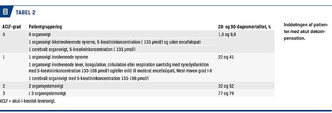 ACLF er således defineret som en tilstand med AD ledsaget af enten nyresvigt, andre organsvigt i kombination med nyredysfunktion, cerebral dysfunktion eller multiorgansvigt. Inddelingen af ACLF giver et klart skel i prognosen med kraftig stigning i dødeligheden ved højere grader af ACLF. I CANONIC-studiet var 28- og 90-dages mortaliteten for patienter med AD uden ACLF hhv. 1,9% og 9,8% [1]. For ACLF-grad 1 steg 28- og 90-dagesmortaliteten til hhv. 22% og 41%, for ACLF-grad 2 til hhv. 32% og 52% og for ACLF-grad 3 til hhv. 77% og 79% [1]. I samme studie havde 23% af patienterne med AD ACLF ved indlæggelse, og hos yderligere 11% udvikledes syndromet inden for 28 dage [1]. Det hyppigste organsvigt hos patienterne med ACFL var