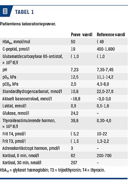 Efter at have fået den fjerde serie med ipilimumab, udviklede hun primær hypotyroidisme med et thyroideastimulerende hormonniveau på 40 × 103 IE/l. En uge senere blev hun indlagt akut med kvalme, opkastninger, svimmelhed og almen utilpashed. Der var mistanke om hypofysitis. De biokemiske prøver viste, at hun havde ketoacidose med følgende målte niveauer: pH 7,23, bikarbonat 7,4 mmol/l, blodglukose 30 mmol/l og blodketoner 5,6 mmol/l. Ved indlæggelsen havde hun kun let forhøjet niveau af glykeret hæmo-globin på 50 mmol/mol (referenceværdien er < 48 mmol/mol), men var insulinopen med et c-peptidniveau på 19 pmol/l, hvilket tydede på hurtig udvikling af tilstanden (Tabel 1). Efter den akutte behandling for ketoacidose, påbegyndte man behandling med basal bolusinsulin. På mistanke om hypofysitis igangsatte man desuden højdosisbehandling med prednisolon og overgik senere til behandling med hydrokortison. En senere ambulant foretaget synactentest viste insufficient respons. Der blev desuden foretaget MR-skanning pga. ukarakteristiske cerebrale symptomer. Skanningen viste ingen tegn på disseminering eller hypofysitis.