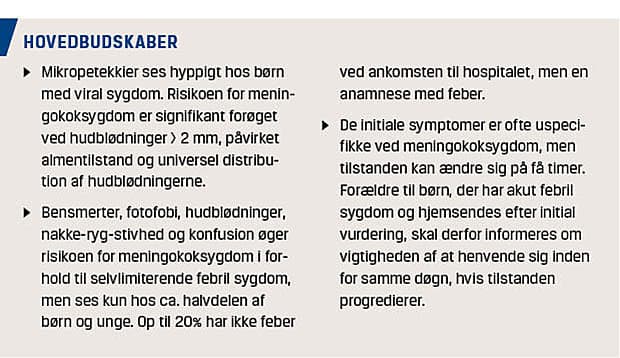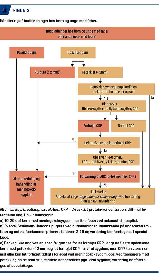 Ikke alle febrile børn med hudblødninger skal behandles for MS (Figur 3). Det estimeres, at < 2% af børn med petekkier (< 2 mm) har MS [7, 8]. Størstedelen af de børn, som har feber og petekkier, har selvlimiterende viral sygdom, primært luftvejsinfektion og gastroenteritis [7, 8].