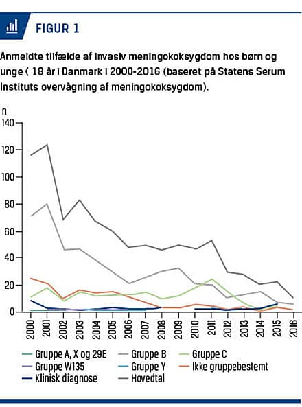 De alvorligste sygdomme, der kan forårsages af Neisseria meningitidis, er meningitis og sepsis. Disse sygdomme kan optræde enkeltvis eller samtidigt og kaldes under ét meningokoksygdom (MS). Forekomsten af MS er faldet støt i de seneste årtier. I de seneste fem år har der været 11-30 tilfælde årligt blandt børn og unge under 18 år i Danmark, i modsætning til over 100 tilfælde årligt i 2000 (Figur 1). Således er sygdommen i dag sjældnere end f.eks. leukæmi hos børn, og de færreste læger vil være involveret i den initiale diagnostik af et barn med MS. Blandt børn og unge er tilstanden hyppigst i alderen < 2 år og 13-19 år, men ses i alle aldre. Mortaliteten blandt børn og unge med MS er ca. 6% i Danmark, svarende til mortaliteten i andre europæiske lande [1]. Mortaliteten er højere ved sepsis end ved meningitis [1]. Tidlig diagnostik og behandling af akut MS kan forbedre prognosen [2], og det er derfor vigtigt, at alle læger har kendskab til de kliniske tegn på MS og særligt de udfordringer, der kan være i forbindelse med at stille diagnosen. Vi vil i denne artikel gennemgå symptomer og kliniske tegn på akut MS samt den initiale behandling.