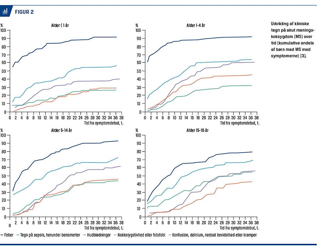 De klassiske tegn på MS som nakke-ryg-stivhed, hudblødninger og/eller septisk shock forekommer kun hos ca. halvdelen af børn med MS [3]. Disse kliniske fund opstår dog ofte mere end 12 timer efter de initiale symptomer (Figur 2). Sene symptomer er nedsat bevidsthedsniveau og kramper. Konfusion er associeret med en 24 fold øget risiko for akut MS i forhold til viral sygdom, og hhv. fotofobi, hudblødninger og nakke-ryg-stivhed er associeret med en 5-6 fold øget risiko [5]. Det er vigtigt at bemærke, at op til 20% af børn med MS ikke har feber ved ankomst til hospitalet, men de fleste har en anamnese med feber inden for det seneste døgn (Figur 2).