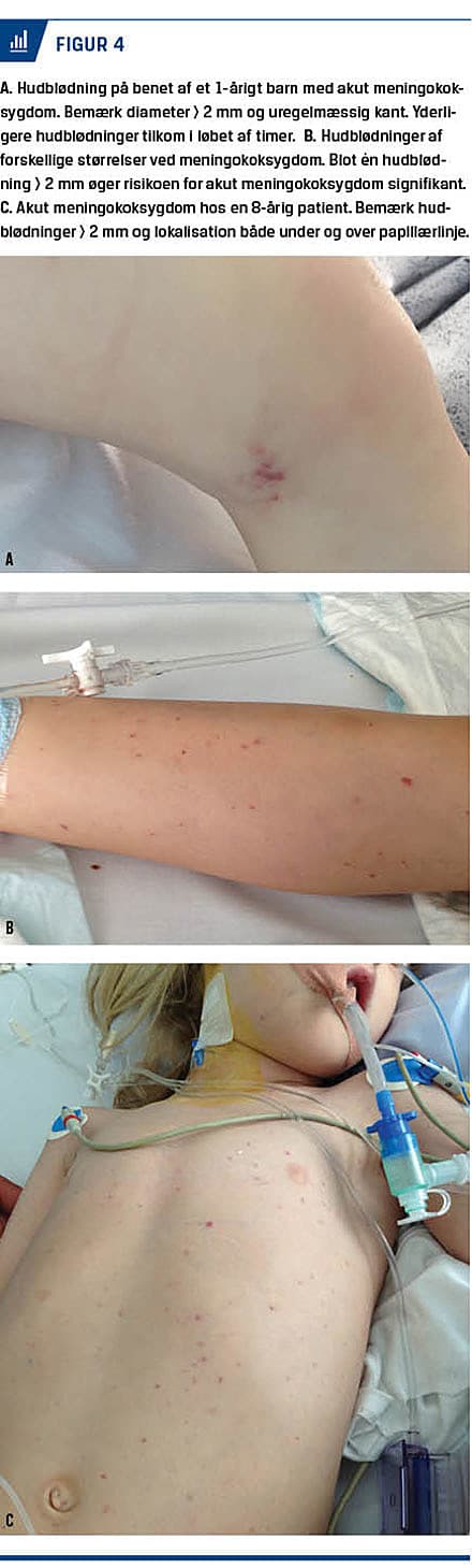 Risikoen for MS er markant forøget, hvis hudblødningerne er > 2 mm i diameter og har et karakteristisk udseende med uregelmæssig kant (Figur 4A) [9, 10]. Størstedelen af børn med MS har både purpura og petekkier, og blot én hudblødning > 2 mm øger sandsynligheden for MS (Figur 4B) [9, 10]. Risikoen er derudover associeret til påvirket almentilstand [10, 11]. Enkelte børn kan dog være upåvirkede tidligt i forløbet. Risikoen for MS er forøget, hvis hudblødningerne er universelt fordelt på kroppen (Figur 4C) [9-11]. Petek-