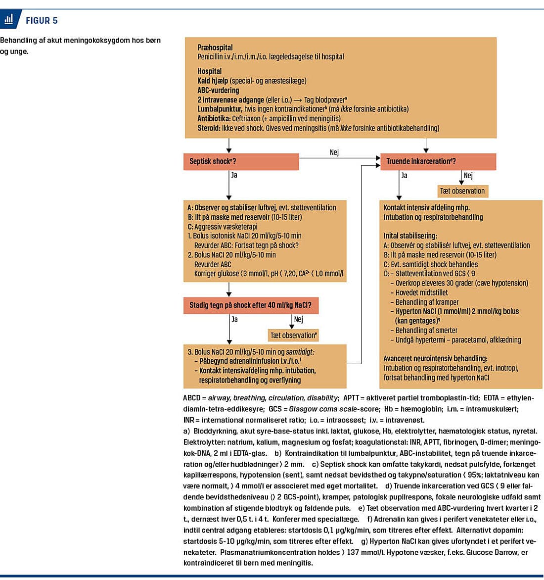Der findes ingen biokemiske undersøgelser, hvormed man kan be- eller afkræfte MS på indlæggelsestidspunktet. De fleste børn, som har akut MS, har markant forhøjet C-reaktivt protein (CRP)-niveau, men op til 10% har normalt eller kun let forhøjet CRP-niveau på indlæggelsestidspunktet [12-14]. CRP-niveauet stiger ofte signifikant inden for det første døgn efter indlæggelsestidspunktet og topper efter 24 timer ved meningitis og efter 48 timer ved septisk shock [14]. Akut MS kan afkræftes, hvis CRP-niveauet er normalt 24 timer efter indlæggelse [14]. Markant stigning i leukocyt- og neutrocytniveauet kan bekræfte mistanken om bakteriel infektion, men ca. 75% af de børn, som har MS, har normalt eller lavt leukocytniveau på indlæggelsestidspunktet [15]. Lumbalpunktur udføres akut ved mistanke om MS, hvis der ikke er kontraindikationer, og såfremt undersøgelsen ikke forsinker antibiotikabehandling (Figur 5) [16]. CT af cerebrum kan ikke anvendes til udelukkelse af forhøjet intrakranialt tryk hos børn med meningitis. I et ældre studie sås normale forhold på en CT for en tredjedel af de børn, der inkarcererede pga. meningitis, [17].