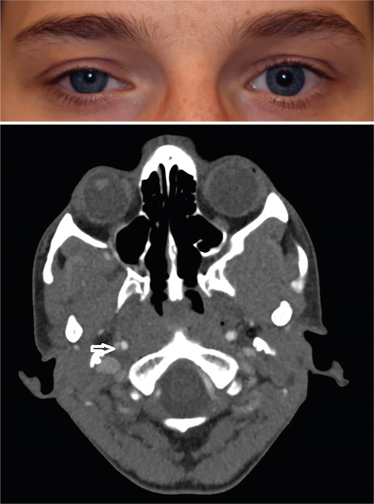 En rask 26-årig kvinde fik højresidigt hængende øjenlåg, pupildifference samt skulder- og nakkesmerter efter styrketræning uden hoved-/nakketraume. Objektiv fandt man højresidig ptose og miosis. Ved test med apraclonidin 0,5% sås begyndende ophævelse af ptosen efter 10 min. Der var mistanke om Horners syndrom, og der blev foretaget CT-angiografi af cerebrum og halskar, hvorved man så dissektion i den distale a. carotis interna. Der blev påbegyndt dobbeltpladehæmmerbehandling (acetylsalicylsyre samt clopidogrel) og planlagt kontrol efter tre måneder.