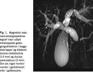 Ved indlæggelsen var alaninaminotransferase (ALAT) 146 U/l (0-35), øvrige blodprøver var normale. Efter en uge steg ALAT til 382, basisk forfataser var 1.072 U/l (250-1.000), og bilirubin var 73 μ M (< 17). Amylasen og ioniseret calcium var normale. Urinstiks var blank. En abdominal UL gav mistanke om pancreatitis. Ved magnetisk resonans-kolangiopankreatografi (MRCP) fandtes udtalt intrahepatisk galdegangsdilatation. Ductus choledocus og ductus pancreaticus var dilaterede og kunne følges til caput pancreatis, men var ikke synlige i caput, hvilket tydede på en kompression (Fig. 1 ). På de aksiale snit sås ødem af pancreas, fortrinsvis i caput og broget opladning efter kontrast, hvilket tydede på inflammation. Endoskopisk retrograd kolangiopankreatikografi viste en trådfin striktur umiddelbart inden for papillen, men ingen sten. Der blev indlagt en endoprotese i nederste del af cholodocus. Patienten havde tydelig bedring klinisk og paraklinisk efter fem uger. Patientens antistoftitre var negative for hepatitis A, Ebstein-Barr virus, cytomegalovirus og enterovirus samt Yersinia- og kuldeagglutination. Der blev ikke fundet mutationer i generne F508 og 394delTT, som i Danmark hyppigst er forbundet med cystisk fibrose. Pigen var ved efterkontrol IgG-positiv for parotitisvirus.