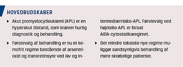 Det har siden midt i 1990’erne været kendt, at APL kan behandles med ATO som monoterapi [27]. Først blev ATO brugt til relapsbehandling. De seneste år har randomiserede kontrollerede studier vist, at ATO + ATRA må betragtes som mindst ligeværdige med konventionelle cytostatikaholdige regimer, hvad angår behandlingsrespons og overlevelse. I de danske nationale behandlingsvejledninger har man siden november 2016 anbefalet kombinationen af ATO + ATRA som førstevalgsbehandling ved APL, ligesom det europæiske lægemiddelagentur og Koordineringsrådet for ibrugtagning af sygehusmedicin anbefaler ATO + ATRA til lav- og intermediærrisiko-APL (patienter med et initialt leukocyttal under 10 × 109/l) [21]. Ved højrisiko-APL er førstevalget forsat AIDA-regimet.