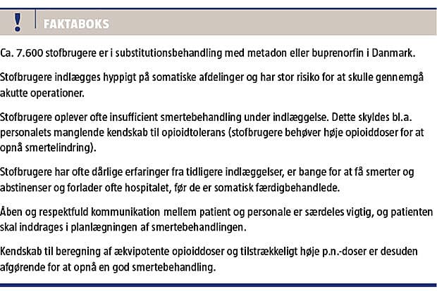 Patienter i substitutionsbehandling er aktive eller tidligere brugere af opioider. De har en stærkt øget forekomst af psykiatriske og somatiske sygdomme og indlægges ofte på somatiske afdelinger. De indlægges typisk pga. infektioner (abscesser, pneumoni, endokarditis osv.), men stofbrugere har også en stor risiko for at skulle gennemgå akutte operationer med sårrevision, excision af abscesser, amputation eller traumekirurgi [2, 3]. Stofbrugere har øget forekomst af kroniske smerter, hvilket i sig selv giver øget følsomhed over for smertefulde stimuli [4].