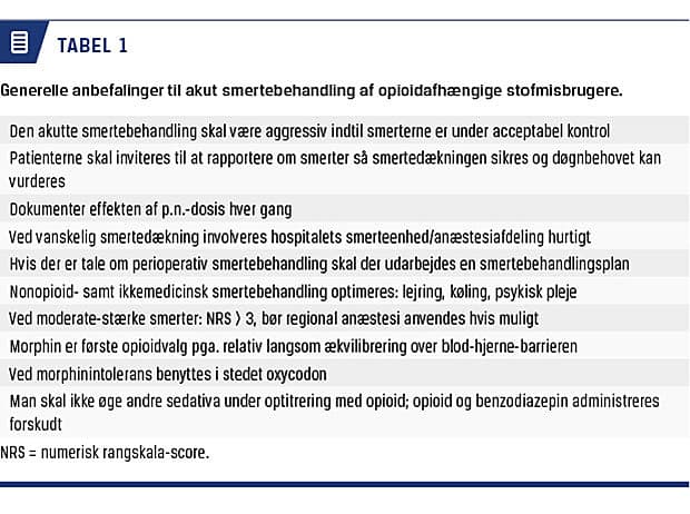 Se Tabel 1 for generelle anbefalinger til den akutte smertebehandling. Behandling af en kronisk smertetilstand hos opioidafhængige patienter følger de anbefalinger, som generelt er gældende [9].