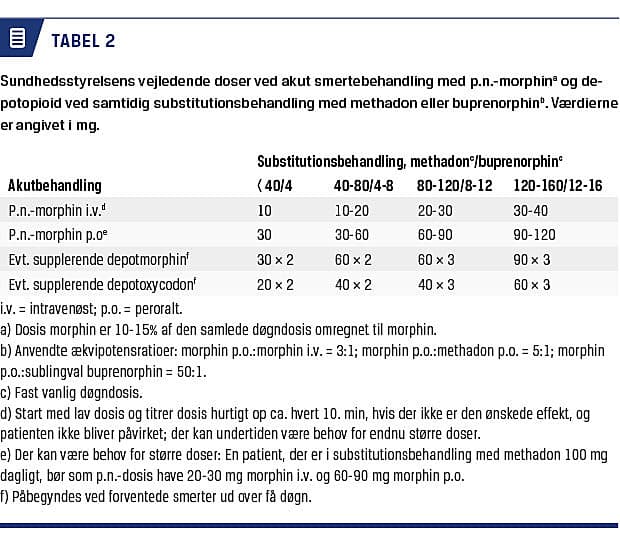 Omregningsfaktoren fra dagsdosis methadon til morphin er meget variabel, men kan som udgangspunkt sættes til 1:5. Det betyder, at hvis den daglige substitutionsdosis er 120 mg svarer det til 600 mg morphin. Smertebehandlingen starter med, at der gives 25% af den ækvivalente beregnede dosis som depotmorphin fordelt på tre doser. Patienten skal derfor have 25% af 600 mg depotmorphin = 150 mg fordelt på tre doser i alt. Der titreres med hurtigtvirkende morphin, hvor den enkelte p.n.-dosis udgør 10-15% af døgndosis af depotopioid, altså i eksemplet 15-20 mg morphin. P.n.-dosis gentages, indtil patientens smerter er under kontrol. Effekt og bivirkninger (specielt sedation og kvalme) skal vurderes ca. en time efter indgift af p.n.-dosis, således at den kan justeres. Hvis patienten har behov for mere end 1-2 doser p.n. i døgnet, øges depotmorphin med 50% af den p.n.-dosis, der er givet i det seneste døgn (Tabel 2) [11].
