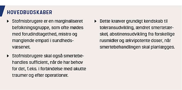 Smertebehandling af opioidafhængige stofmisbrugere er vanskelig og kræver viden om de præparater, de indtager, samt forståelse og empati for en marginaliset befolkningsgruppe. Forudindtagethed og fordømmelse af patienterne i forbindelse med kontakten til sundhedsvæsenet tjener kun til forværring af deres situation. For stofmisbrugere, der er i substitutionsbehandling, er det vigtigt at kende til ækvipotente doser, når akut smertebehandling med opioider skal ordineres. Både stofmisbrugerens smerter og abstinenssymptomer skal behandles i et tæt og tillidsfuldt samarbejde med patien-