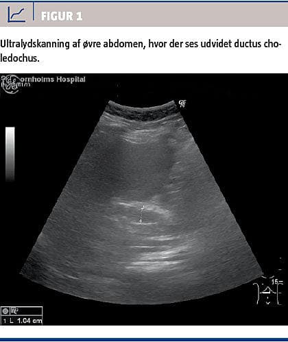 Ved en akut ultralydskanning af abdomen påviste man galdesten uden fortykkelse af galdeblærevæggen og dilateret ductus choledochus til omtrent 10 mm (Figur 1).
