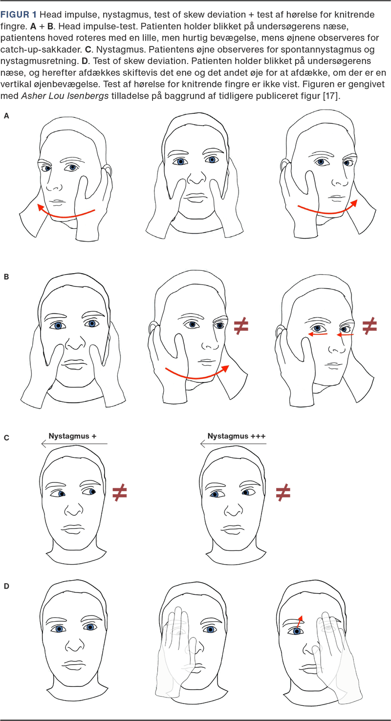 Forkortelsen HINTS+ står for head impulse (hovedimpulstest), nystagmus (evaluering af nystagmus) samt test of skew deviation, og ”+” betyder test af hørelse for knitrende fingre (finger rubbing) [16, 17] (se Figur 1). HINTS+ er en klinisk undersøgelsesmetode bestående af fire bedside tests, der kan hjælpe med til at adskille centrale fra perifere årsager ved AVS (se Tabel 2).