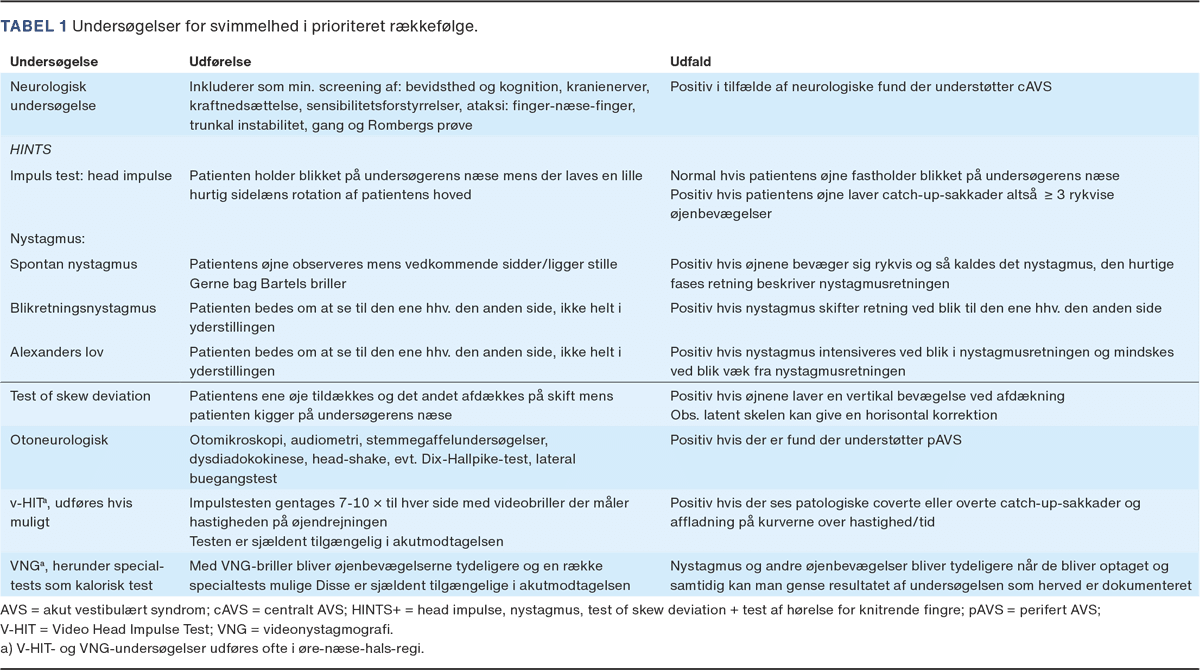 Akut svimmelhed er et hyppigt og komplekst symptom, der kan have en række forskellige årsager. Den estimerede incidens af svimmelhed, der fører til kontakt til akutmodtagelser, er 3,3% [1]. Alment praktiserende læger og øvrige speciallæger møder regelmæssigt denne patientgruppe. Da årsagerne er mangfoldige, kræver håndtering af akut svimle patienter systematik. En særlig udfordring består i hurtigt at kunne identificere alvorlige og potentielt livstruende tilstande. I denne sammenhæng er det afgørende at kunne skelne mellem neurologiske, otologiske og medicinske tilstande. En helt essentiel opgave er at differentiere mellem centrale vestibulære (cerebrale) og perifere vestibulære årsager i den akutte fase, da svimmelhed kan være det eneste symptom på eksempelvis et cerebellart eller pontint stroke [2-4].