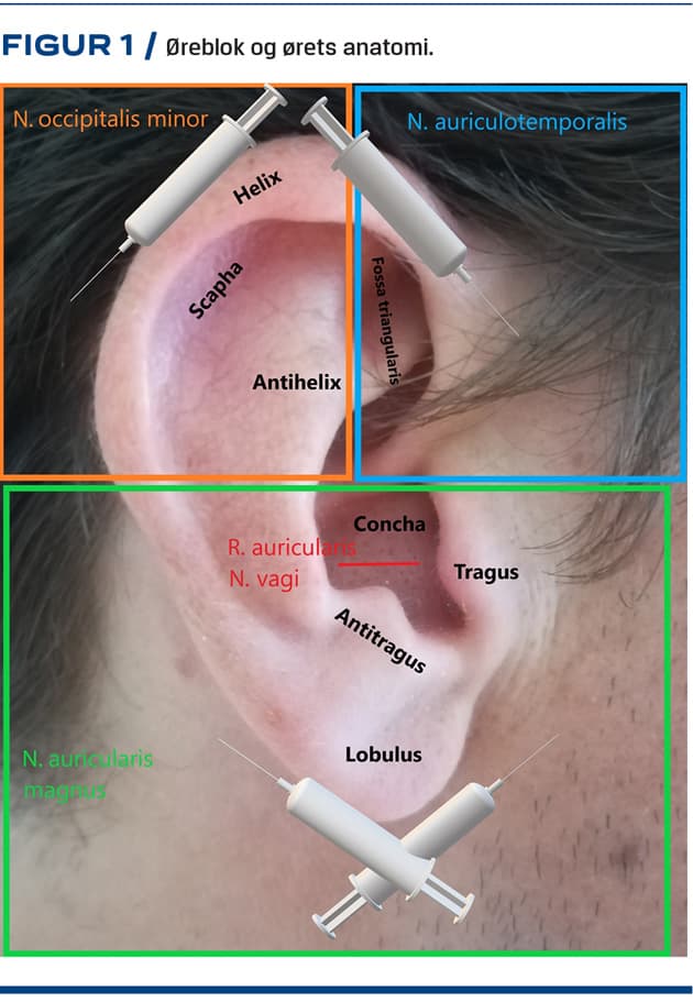 Før videre behandling af et ydre øretraume bør der anlægges et øreblok (Figur 1) [3], alternativt anlægges der infiltrationsanalgesi, og ofte anlægges begge. Der kan uden risiko for vævsnekrose anvendes lidocain tilsat adrenalin 5 µg/ml [4]. Fordelene ved lokal infiltrationsanalgesi er et bedret overblik pga. adrenalins karkontraherende effekt og deraf mindre blødning, og den kan derudover hos den mindre erfarne læge være nemmere at anlægge end øreblokket. Ulemperne er lokal afblegning og skævvridning af vævet samt ødem i området, hvilket kan besværliggøre korrekt adaptering [5]. Ubehag i form af smerter ved injektion af lokalbedøvelsen reduceres ved at opvarme lokalbedøvelsen til kropstemperatur, anvende en relativt høj kaliber nål, tilsætte f.eks. bikarbonat som buffer og injicere lokalanalgesiet langsomt [6].