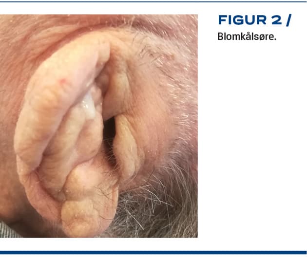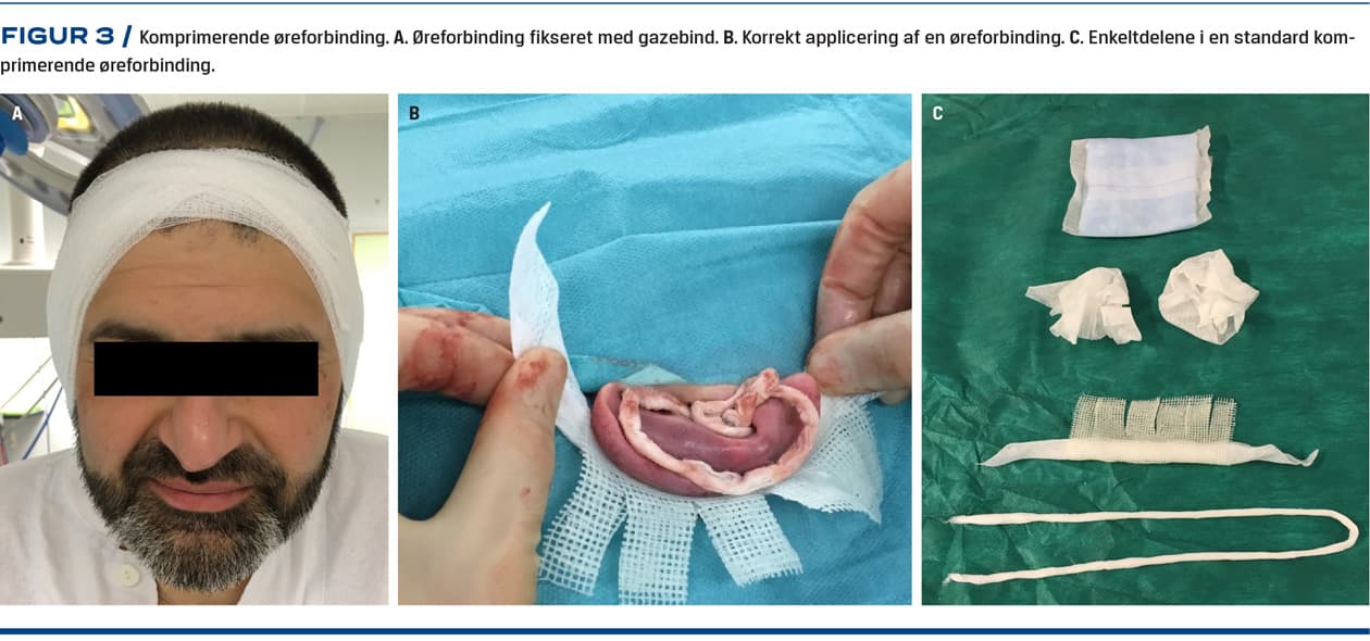 Et aurikulært hæmatom skyldes som oftest et stumpt traume f.eks. et slag mod det ydre øre i forbindelse med vold eller kontaktsport, men ses også ved faldtraumer, hvor patienten er landet på øret. Traumet mod øret kan føre til karbristninger og dannelse af et hæmatom mellem perikondriet og brusken. Den avaskulære brusk mister derved sin blodforsyning og kan som følge heraf undergå nekrose og inficeres. Ubehandlet kan dette føre til brusktab og arvævsdannelse – et såkaldt blomkålsøre (Figur 2) [3]. Et aurikulært hæmatom ses typisk som en øm, blåligt misfarvet, spændt og fluktu_erende hævelse på den anteriore flade af auriklen mellem antihelix og helix og kan strække sig til fossa triangularis. Der er i litteraturen beskrevet mange forskellige teknikker til evakuering af det aurikulære hæmatom [7]. Der er bred enighed om, at behandlingen hviler på hurtig diagnostik, tidlig drænage og forhindring af gendannelse af hæmatomet. Generelt bør patienten henvises subakut til en øre-næse-hals-afdeling for videre behandling. Indledningsvis desinficeres øret efterfulgt af lokal anæstesi (Figur 1). Herefter foretages der enten aspiration med en kanyle eller incision med henblik på drænage af hæmatomet. Ved større eller gendannede hæmatomer og hæmatomer, der er > 6-48 timer gamle, anbefales incision og drænage frem for aspiration [3 ,8]. Incisionen lægges ved basis af hæmatomet og enten lige over antihelix’ kontur eller alternativt under helixranden for at skjule arret bedst muligt [3]. Hæmatomet evakueres, og efterfølgende skylles der med sterilt saltvand til klart tilbageløb. Der installeres et sterilt handskedræn, alternativt en aquacelmeche, i kaviteten for at sikre den fortsatte drænage. I flere udenlandske studier lukkes incisionen efter drænage med 5-0 nonresorberbare nylonmadrassuturer for at minimere dead space mellem brusk, perikondrium og hud og derved mindske risikoen for gendannelse af hæmatomet [3, 8-11]. Dette er ikke rutinemæssig praksis i Danmark. Sluttelig anlægges en komprimerende øreforbinding (Figur 3) for at undgå gendannelse af hæmatomet. Ambulant kontrol hver anden/tredje dag i den første uge anbefales med henblik på at foretage eventuel drænage af et gendannet hæmatom og vurdering af eventuelle komplikationer i form af infektion og abscesdannelse. Generelt frarådes kontaktsport i seks uger.