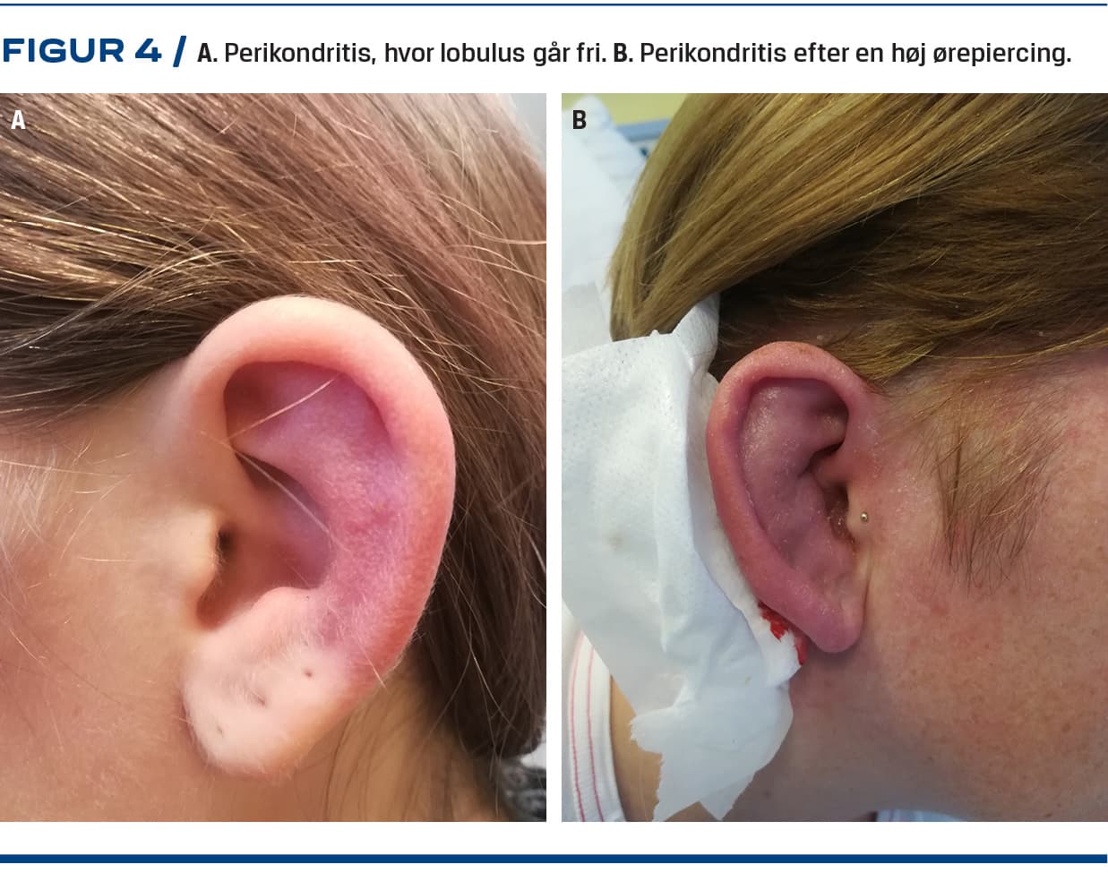 Aurikulær perikondritis er egentlig en misvisende betegnelse, da tilstanden er en inflammation af både perikondriet og den underliggende ørebrusk. Et stumpt traume med dannelsen af et aurikulært hæmatom og sekundær infektion af perikondrium og brusk er den hyppigste årsag til tilstanden, men perikondritis ses også som komplikation efter penetrerende skader af det ydre øre som f.eks. transkartilaginøs ørepiercing, akupunktur m.m. [12]. Desuden forekommer perikondritis som en autoimmun tilstand. Perikondritis ses klassisk som en smertefuld hævelse, erytem og varme af auriklen, hvor lobulus går fri, da denne ikke indeholder brusk (Figur 4) [12].