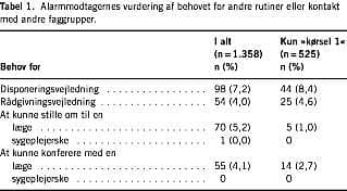 Alarmmodtagernes vurdering af behovet for en disponerings/rådgivningsvejledning og behovet for at kunne stille anmelderen om til eller kunne konferere med sundhedsfagligt personale er vist i Tabel 1 . I 32 tilfælde (2%) blev der angivet behov for både en disponerings- og en rådgivningsvejledning. Tabel 1 viser også, at de fleste af de tilfælde, hvor alarmmodtagerne angiver et behov for at kunne konferere med en læge, er tilfælde, hvor de er i tvivl om, hvorvidt det er nødvendig at sende en ambulance.