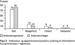 Summary Medical emergency calls and ambulance dispatch in Copenhagen Ugeskr Læger 2004;166: 1229-1232 Introduction: The aim of the study was to investigate selected procedures at the regional emergency dispatch center in Copenhagen. Materials and methods: Data from 1358 emergency calls for ambulances were collected. Results: In 942 cases (69%), the dispatchers believed that they were able to get the necessary information from the caller. In 18% of the emergency calls, the dispatchers felt a need to have better procedures or to be able to discuss the call with a doctor or put the doctor into direct contact with the caller. In 58% of the emergency ambulance dispatches, the codes used for communication between the dispatch centre and the ambulances were regarded as adequate by the dispatcher, and in 73% of the dispatches the EMTs thought the information given was sufficient. The physician-manned ambulance staffs regarded the information as being sufficient in 66% of the cases. Discussion: There seems to be a need for better routines and procedures regarding call taking and ambulance dispatch, and there might be a need for the dispatch centre to have the opportunity to discuss difficult cases with an on-duty doctor.