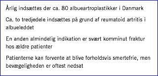 Summary Elbow arthroplasty Ugeskr Læger 2006;168(19):1844-1847 Each year, about 80 elbow arthroplasties are performed in Denmark. Approximately two thirds are done due to rheumatoid arthritis, the others due to comminuted fractures of the elbow, especially in elderly patients. The prosthesis is fixed with or without bone cement, and there are two different types of elbow prostheses: linked, in which the humerus and ulna are connected by a sloppy hinge, and non-linked, in which stability is dependent on the soft tissues of the elbow. Good pain relief can be expected, but the range of motion will usually be permanently affected.