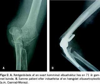 Ved komminutte brud i den distale humerus kan der være indikation for total albueartroplastik, især hos ældre osteoporotiske patienter med intraartikulære brud, hos hvem reposition og osteosyntese ikke er mulig (Figur 2 ) [8-11] og ligeledes kan smerter og bevægeindskrænkning efter sådanne brud være indikation for total albueartroplastik [12]. Der findes et beskedent indikationsområde for total albueartroplastik hos patienter med udtalt instabilitet [13, 14] eller udtalt stivhed af albuen [15] og hos patienter med albuedestruktion pga. hæmofili [16]. Endelig er primær artrose i albuen en sjælden indikation for albueartroplastik [17, 18].