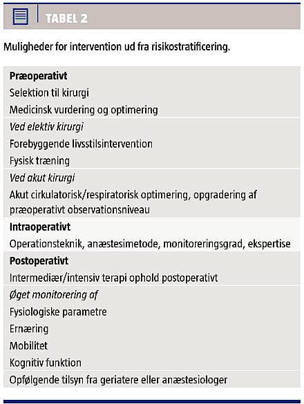 Der er begrænset evidens for, at præoperativ optimering, der forsinker det akutte operative indgreb, er indiceret, men betydelig evidens for, at operationsforsinkelse øger morbiditeten og mortaliteten, hvorfor indførelsen af tiltag, der potentielt forsinker det operative indgreb, bør være strengt evidensbaserede [24, 25]. Den præoperative risikovurdering bør således primært fokuseres på evt. opgradering af observationsniveau og optimering af den cirkulatorisk og respiratorisk status, der sandsynligvis er associeret med bedret udkomme. Der foreligger ikke specifik evidens for, hvilke patienter der har gavn af optimeret præoperativ monitorering/terapi, og det forekommer derfor rationelt at bruge samme indikatorer, som er prædiktive for postoperativ mortalitet. Der bør endvidere være særlig fokus på intraoperativ monitorering og høj ekspertise på både den kirurgiske og den anæstesiologiske del af det perioperative team [23, 26] (Tabel 2).