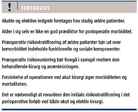 risiko for død, bør der kun afstås fra at operere de patienter, hvor operationen ligeledes giver en næsten 100% risiko for død eller varigt uacceptabelt funktionstab. Alder i sig selv er ikke en specifik prædiktor for dette. Ved hoftefrakturkirurgi er det præfrakture funktionelle niveau og komorbiditeten (American Society of Anesthesiologists (ASA)-score) fundet at have højere korrelation med postoperativ mortalitet end høj alder. Tilstedeværelsen af demens eller bopæl på plejehjem var lige så betydende som høj alder [19]. Ved akut abdominal kirurgi har risikostratificering i vid udstrækning været baseret på scoringssystemer, hvor alder indgik sammen med akutte fysiologiske parametre [21].