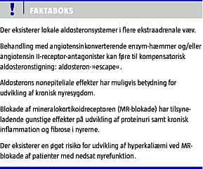Indikationen for yderligere at efterforske området er i den grad begrundet, dels i det ovenstående, men også fordi de nuværende behandlingsregimer med henholdsvis ACE-hæmmere og ARB ikke tilstrækkeligt bremser progressionen af kronisk nyreinsufficiens, muligvis grundet aldosteron-»escape«-fænomenet. En tilbagevendende problemstilling ved blokering af renin-ANG II-aldosteron-systemet er hyperkalæmi. Risikoen for at udvikle hyperkalæmi ved MR-blokade, specielt som tillæg til ACE-hæmmer eller ARB, er forhøjet med en faktor tre, og den er størst hos patienter med nedsat GFR [1]. Sikkerheden ved benyttelse af MR-blokade i klinikken vil derfor i fremtiden kræve yderligere efterforskning.