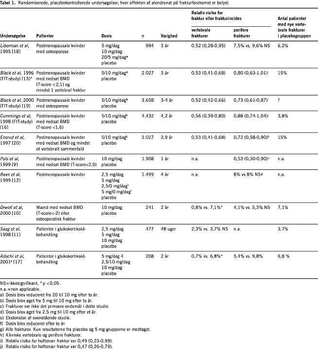 I en række placebokontrollerede, dobbeltblinde, randomiserede undersøgelser har man undersøgt effekten af alendronat som sekundær og tertiær profylakse mod postmenopausal osteoporose med frakturer som effektmål. Som det fremgår af Tabel 1 , reducerer alendronat 10 mg/dag incidensen af vertebrale frakturer ved postmenopausal osteoporose med ca. 48% i forhold til placebo. I to studier reducerede alendronat desuden signifikant forekomsten af frakturer i det perifere skelet (Tabel 1 ).