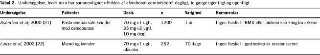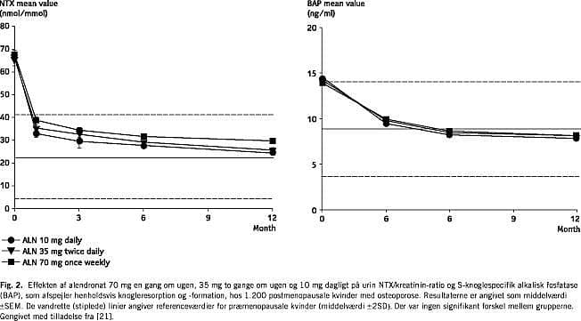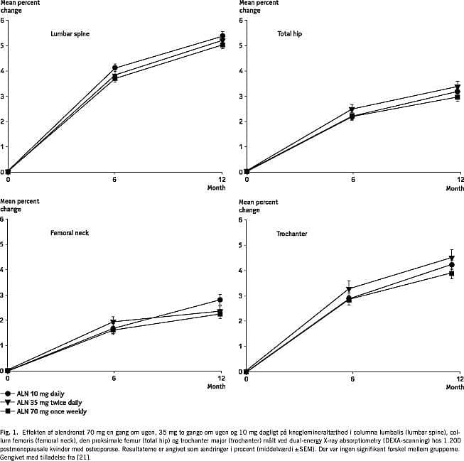 Effekten af alendronat 70 mg en gang om ugen er undersøgt i to publicerede studier (Tabel 2 ). I et dobbeltblindt design sammenlignede Schnitzer et al [21] effekten af alendronat 70 mg en gang om ugen, 35 mg to gange om ugen og 10 mg dagligt hos 1.200 postmenopausale kvinder med osteoporose (T-score < 2,5 eller tidligere hofte- eller vertebralfraktur). Studiet var dimensioneret således, at der var 90%'s sikkerhed for at påvise forskelle på 1,5% i BMD i columna lumbalis mellem behandlingerne. Der var ingen signifikant forskel mellem de tre grupper mht. BMD målt ved DEXA-skanning i columna lumbalis, collum femoris, trochanterregionen og den proksimale femur (Fig. 1 ) [21]. Alendronat 70 mg en gang og 35 mg to gange om ugen havde endvidere samme effekt som alendronat 10 mg/dag på urin-NTX-kreatininratio og S-knoglespecifik alkalisk fosfatase, som i en række andre studier er vist at afspejle knogleresorption og -formation (Fig. 2 ) [21]. Der foreligger ingen undersøgelser af effekten af alendronat 70 mg/dag på frakturforekomsten, men ændringer i BMD under alendronatbehandling er relateret til effekten på frakturforekomsten [23]. Da virkningsmekanismen desuden er kendt og formentlig identisk ved de to administrationsformer, synes det at være rimeligt at ekstrapolere fra ovennævnte studier og antage, at alendronat 70 mg en gang om ugen og 10 mg dagligt har samme effekt på frakturforekomsten. Alendronat er i Danmark kun indregistreret til behandling af postmenopausal osteoporose, men en række data dokumenterer anvendelsen ved glukokortikoidinduceret osteoporose og hos mænd med osteoporose (se ovenfor). Der foreligger imidlertid ikke data vedrørende effekten af 70 mg en gang om ugen på disse indikationer.