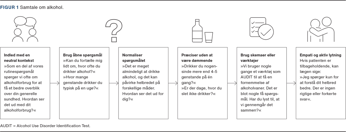 Samtale om alkoholforbrug skal foregå på en respektfuld og ikkestigmatiserende måde og kan med fordel indeholde en screening af alkoholforbrug (Figur 1). Alcohol Use Disorder Identification Test (AUDIT) og Cut down, Annoyed, Guilty, Eye-opener - Copenhagen (CAGE-C) er screeningsværktøjer validerede til opsporing af alkoholforbrug, som kan være skadelige eller tyde på afhængighed [11, 12].