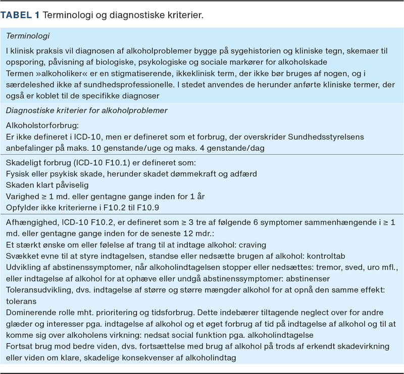 Cirka 402.000 danskere har et moderat alkoholproblem, mens 67.000 danskere har tegn på svære alkoholproblemer (Tabel 1) [1]. Alkohol er årsag til 70-80% af alle leversygdomme i Danmark, og cirrose er den hyppigste alkoholrelaterede dødsårsag. Alkoholrelateret leversygdom varierer i sværhedsgrad fra simpel fedtlever til alkoholrelateret hepatitis og cirrose [2]. Udviklingen er ofte asymptomatisk og langsomt progredierende og derfor underdiagnosticeret [3].