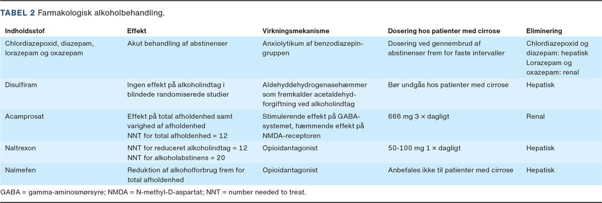 Farmakologisk alkoholbehandling omfatter både den akutte behandling af abstinenser samt den recidivforebyggende behandling (Tabel 2). Langtidsvirkende benzodiazepiner som chlordiazepoxid er hjørnestenen i abstinensbehandling og doseres efter sværhedsgraden af abstinenssymptomer. Chlordiazepoxid kan sikkert anvendes til patienter med alkoholrelateret leversygdom. Symptombaseret dosering anbefales frem for fast dosering for at undgå sedation og ultimativt hepatisk encefalopati hos patienter med abstinenser og cirrose [5, 10, 19]. Starter man afrusning under indlæggelse, er det vigtigt at sikre, at patienten medgives tilstrækkeligt chlordiazepoxid til afrusningsforløbet for at forhindre hurtigt recidiv af abstinenser og craving.