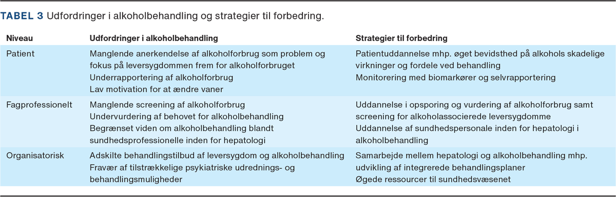 Behandling af alkoholrelateret leversygdom og alkoholproblemer er præget af flere komplekse udfordringer, som er knyttet til både patient, sundhedsprofessionelle og sundhedsvæsenet [25] (Tabel 3). På patientniveau er de vigtigste barrierer manglende anerkendelse af, at alkoholforbruget udgør en helbredstrussel. Selv når patienten opnår denne indsigt, kan det være angstprovokerende at skulle droppe alkohol, da den hos nogle er selvmedicinering eller udgør omdrejningspunktet i hele deres sociale liv og har været deres livslange følgesvend [26]. Desuden optræder psykisk sygdom, i særdeleshed angst og depression, hyppigere hos patienter med alkoholproblemer [27-29]. Patienter med dobbeltdiagnose har vist sig at have en dårligere prognose, og det er derfor afgørende, at patienter i behandling for alkoholproblemer udredes for psykisk komorbiditet. Da psykiatrien ofte ikke vurderer patienter, der har alkoholforbrug, bør dette initialt ske ved den læge, der kender patienten bedst. Endelig mangler patienterne ofte viden om de behandlingsmuligheder, der findes, og forbinder ofte alkoholbehandling med et ensidigt tilbud om disulfiram og frygter at møde stigmatisering fra sundhedsprofessionelle [26, 30].