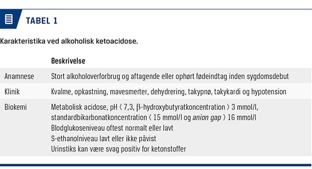 Alkoholisk ketoacidose karakteriseres som andre metaboliske acidoser ved pH < 7,3 mmol/l, koncentrationer af hhv. blodketonstoffer (β-hydroxybutyrat) > 3 mmol/l og standardbikarbonat < 15 mmol/l samt anion gap > 16 mmol/l (Tabel 1) [11]. Anden årsag til metabolisk ketoacidose skal være udelukket, og acidosen skal være opstået hos en person med kendt eller (anamnestisk) rapporteret kronisk alkoholoverforbrug. Tilstanden ses oftest efter et pludseligt ophør af alkoholindtag efter nogle dage med excessivt alkoholindtag i forbindelse med ophør af (eller minimal) fødeindtag [9, 12].