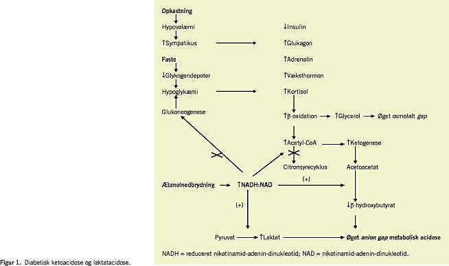 Alkoholisk ketoacidose (AKA) og alkoholisk laktatacidose (ALA) er oversete tilstande med karakteristisk anamnese, symptomer og biokemi (Figur 1). Tilstandene ses hos alkoholikere, der efter en større druktur får kvalme, opkastninger og mavesmerter, og stopper med alkohol- og fødeindtagelse. De typiske symptomer er takykardi, hypotension, takypnø, abdominal ømhed og bevidsthedssvækkelse. Biokemisk findes metabolisk acidose med forhøjet anion gap , normalt/lavt blodsukker og en alkoholkoncentration, der er nul eller lav. Ketostixreaktionen er ofte positiv, men kan være negativ. Laktat, kreatinin og karbamid kan være forhøjede [1]. AKA er let at behandle og har en god prognose, men kan ubehandlet være årsag til pludselig uventet død [2].