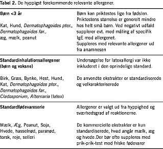De forskellige procedurer for allergidiagnostik gennemgås i Tabel 1 [3-9]. SPT kan foretages i almen praksis, i speciallægepraksis og på hospital. Udredning af sjældne og alvorlige allergier bør centraliseres. De mest relevante luftvejsallergener er samlet i et standardpanel (Tabel 2 ).