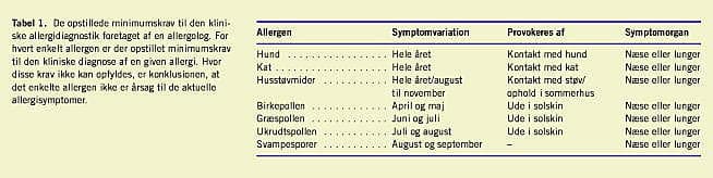 Allergidiagnostikken omfattede en primær klinisk vurdering ved en allergilæge, hvor man ud fra sygehistorie alene med objektiviserede minimumskrav til klinisk allergidiagnostik vurderede, om der forelå en klinisk betydende allergi over for de syv hyppigste allergener (Tabel 1). Denne kliniske vurdering blev foretaget uden kendskab til resultatet af kutantest eller Phadiatopanalyse.