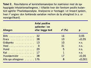 I modsætning hertil var korrelationen mindre mellem de enkelte resultater af kutantest og Phadiatopanalyse udført på samme tidspunkt. For de syv hyppigste allergener med en positiv reaktion i en eller begge systemer (n = 176) var der en korrelationskoefficient i et lineært system på 0,28 (p<0,001), men kun 8% (r2 = 0,08) forklaret variation mellem de to systemer (Tabel 2). For de enkelte allergener var der kun signifikant sammenhæng for de tre med flest positive reaktioner, men igen med maksimalt knap 20% forklaret variation mellem resultaterne af de to testsystemer (Tabel 2).