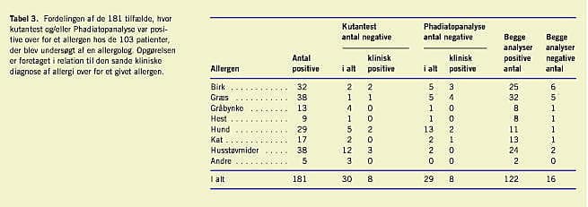 Resultaterne af de to testsystemer kan således bedst sammenlignes kvalitativt. Blandt de i alt 103 patienter, der blev udredt med både kutantest og Phadiatopanalyse hos en allergilæge, blev der fundet i alt 181 tilfælde, hvor kutantest og/eller Phadiatopanalyse var positiv over for et af de testede allergener. I 122 tilfælde var der kvalitativt overensstemmelse mellem positiv kutantest og Phadiatopanalyse, mens der i 59 tilfælde var uoverensstemmelse. Resultaterne for de enkelte allergener vurderet i forhold til den sande diagnose ved den kliniske vurdering fremgår af Tabel 3, hvor det ses, at eksempelvist 32 patienter havde en positiv kutantest og/eller Phadiatopanalyse mod birk. Hos 25 patienter var resul-tatet kvalitativt ens, mens henholdsvis to og fem patienter havde en negativ kutantest og en positiv Phadiatopanalyse eller omvendt en negativ Phadiatopanalyse og en positiv kutantest. Af de sidstnævnte syv blev to ud af to af en allergilæge bedømt til at have klinisk betydende birkepollenallergi, mens tilsvarende tre ud af fem patienter med negativ Phadia-topanalyse og positiv kutantest klinisk blev bedømt til at have aktiv birkepollenallergi. Seks patienter blev klinisk bedømt til at have birkepollenallergi, men deres resultat var negativt i begge testsystemer (Tabel 3).